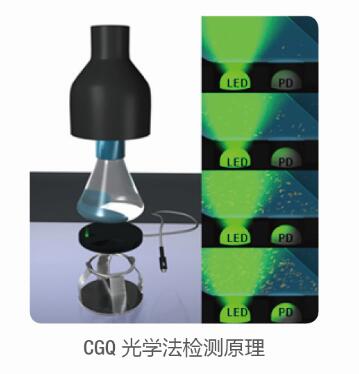 CGQ通过底部的LED灯发射光线,检测器通过OD600nm波长进行生物量测定。生物量与检测器的光线检测量成正比。